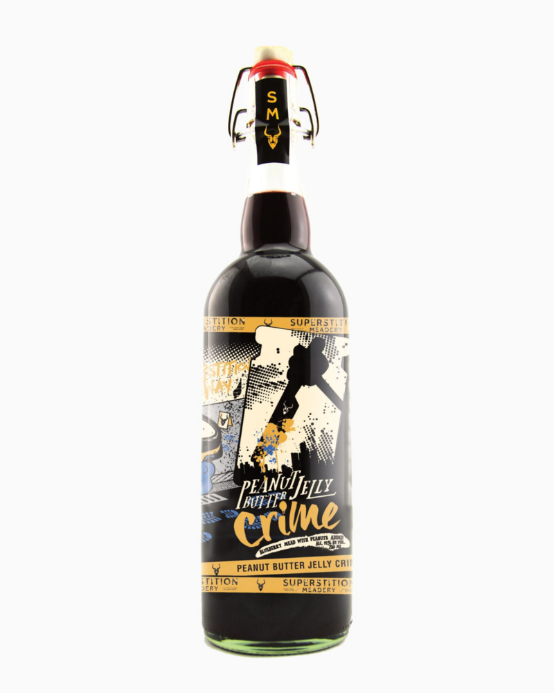 Peanut Butter Jelly Crime is a PB&J sandwich in a bottle. This classic American sandwich is nostalgic and a really cool part of the collective American identity. This product has proven to be an instant cult classic, with releases selling out quickly and even once crashing our website. It is ranked as a top 50 mead in the world on Ratebeer.com with a score of 99 points and is a top 50 mead in the world on Untappd.
